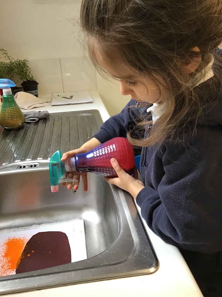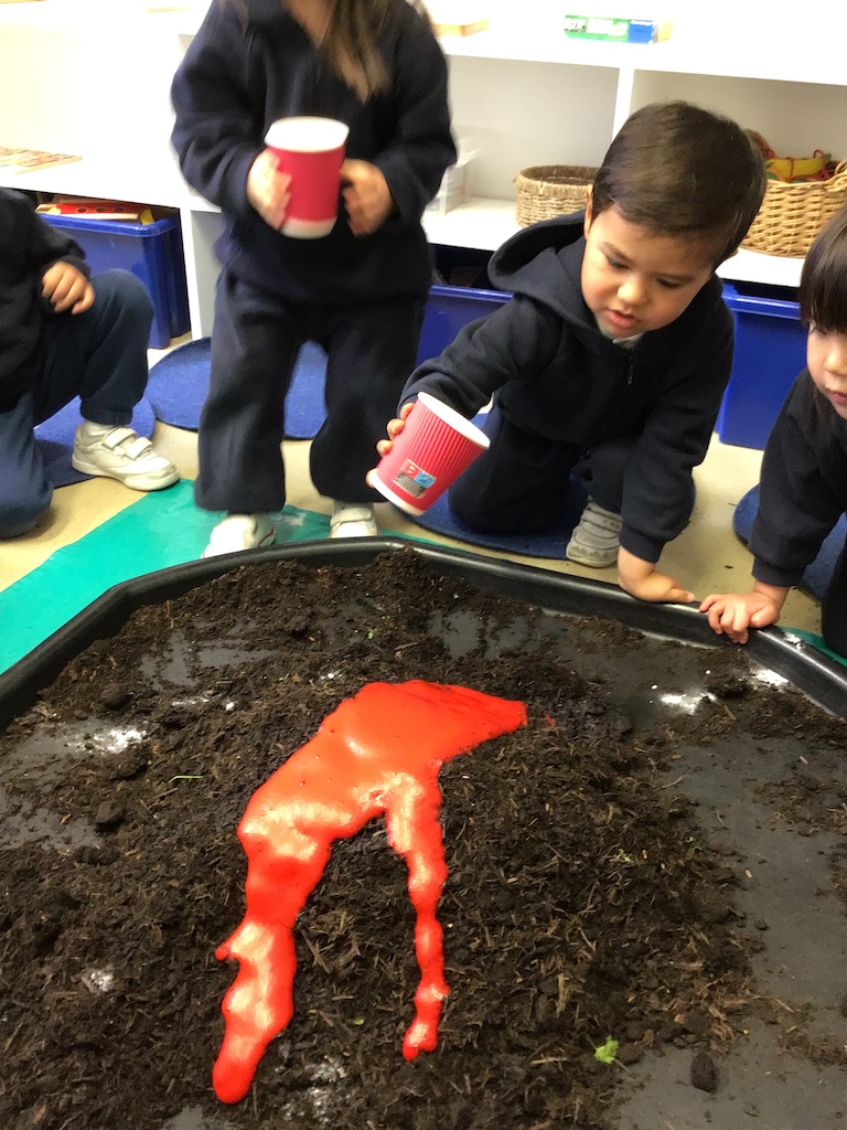 In the letter room we focused on the sound ‘v’. Volcanos were both created in art and in experiments using baking soda, red food colouring and vinegar. Those who wished, added the ingredients to our mountains then stood back to watch our volcanos erupt!