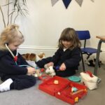 Our nook under the stairs became a police station where people could come when they had a worry and needed help. Eyes were peeled for Miss Mulloy, Mrs Gardner and Miss Tucker, whose photos were up on the wall of the station. All wanted, all on the run and all considered ‘very sporty’! In the letter room, our corner became a sanctuary for hurt and poorly pets. The vets on duty were kept very busy tending to a variety of pets.