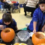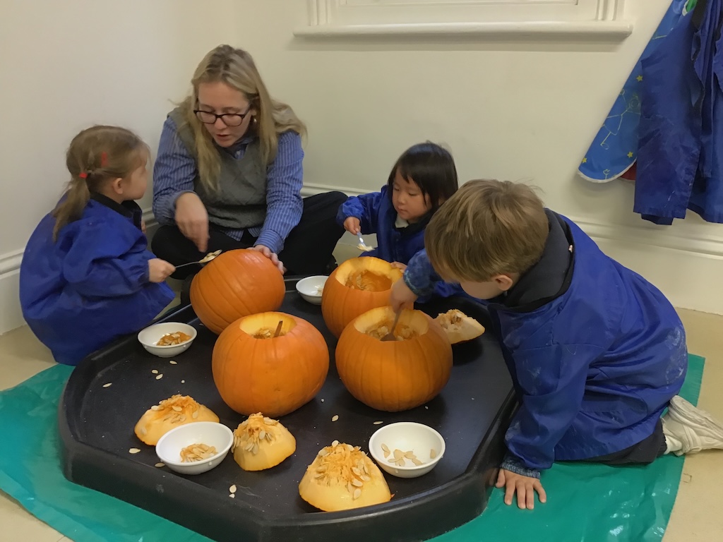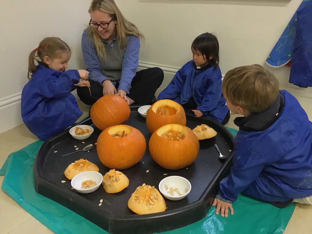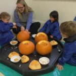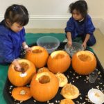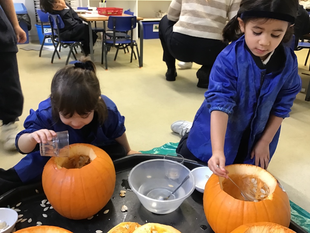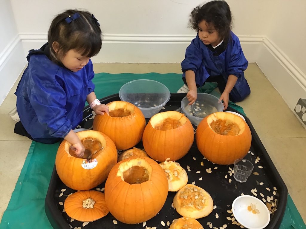 From laughter to quiet uncertainty and smiles to grimaces, a lot of emotions were experienced whilst taking part in the sensory experience of exploring the inside and outside of pumpkins. Those who were keen, collected seeds in in amongst the fibrous strands. More were eager to add jug fills, cup fills and spoons fills of water to make ‘pumpkin soup’!