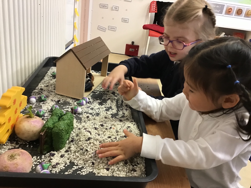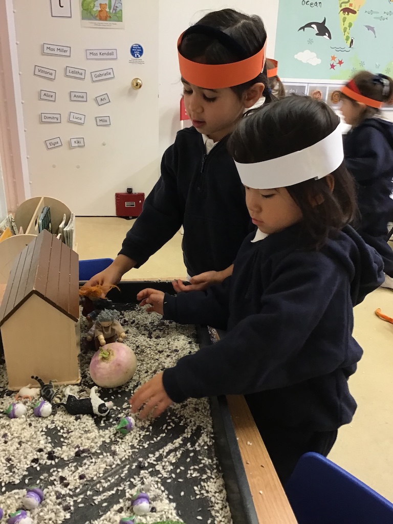 In the letter room, we focused on the ultimate harvest tale, ‘The Enormous Turnip’. Variations of the tale were read and told using story props. The children had a lot of fun acting out the story and re-telling their version to their friends.