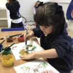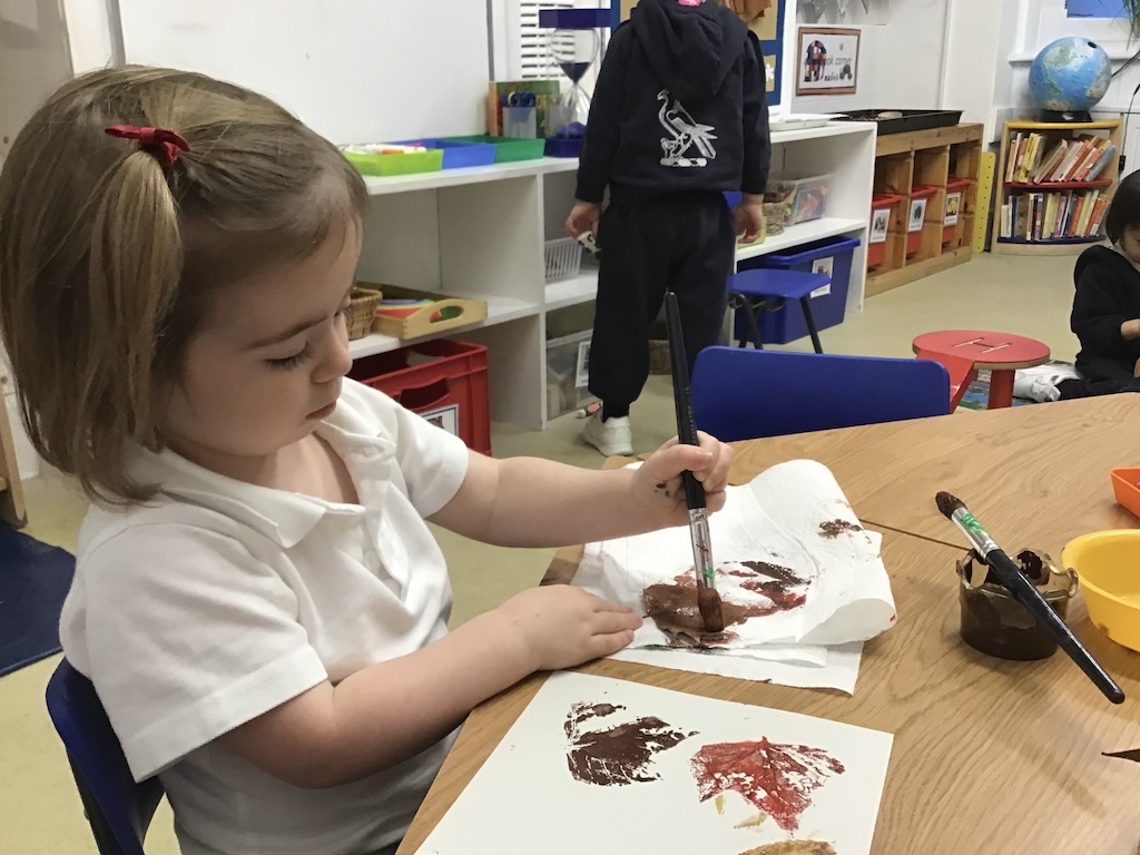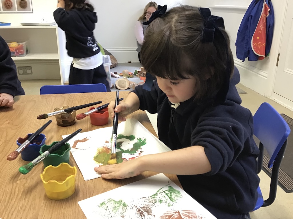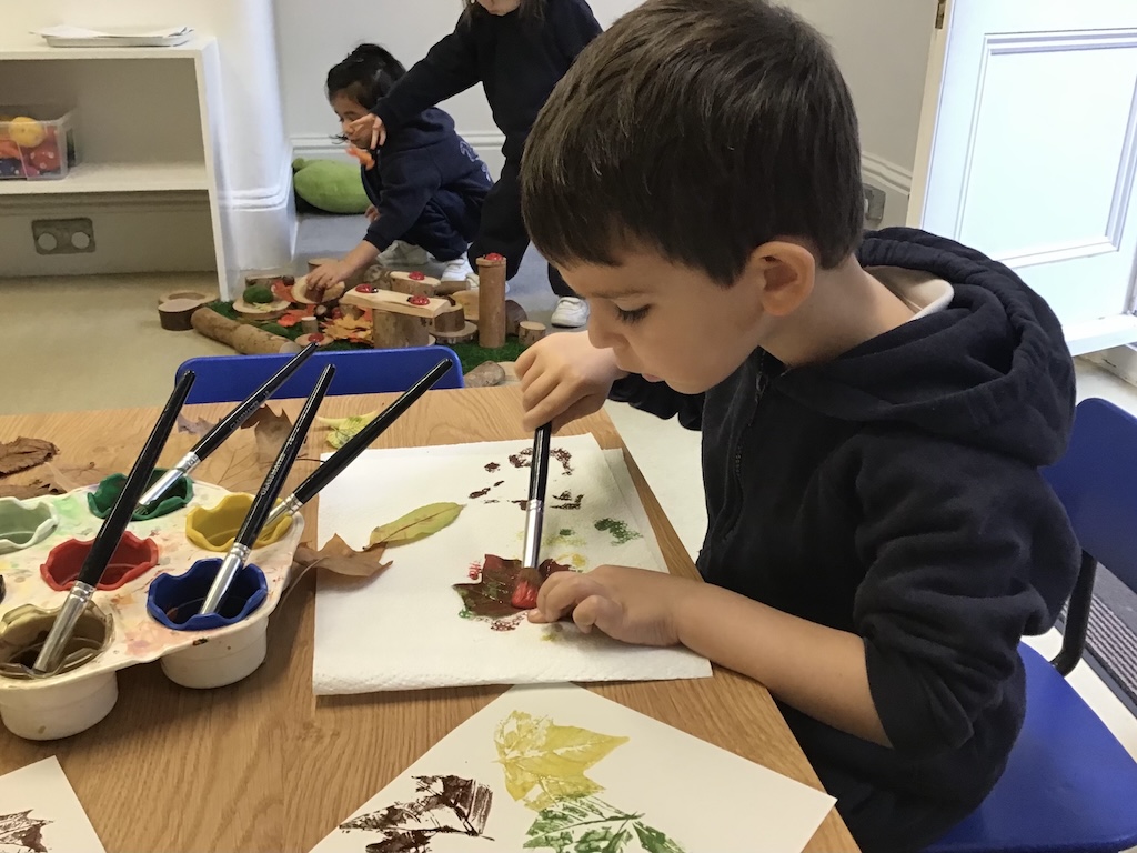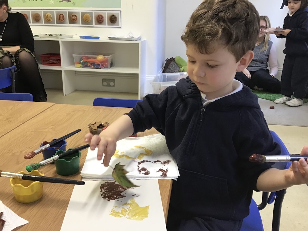 In the playground we collected sycamore seeds to throw into the air. Fallen leaves were also collected from the tulip tree in the playground and those blown in from our neighbour’s gardens for leaf matching and printing activities.