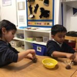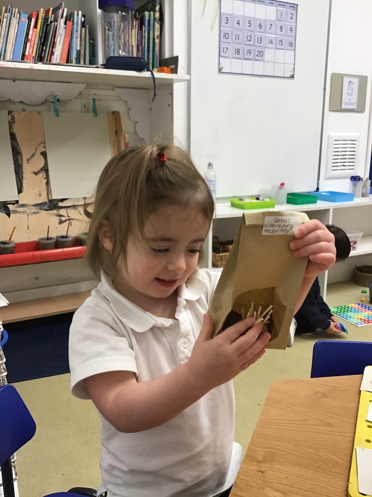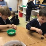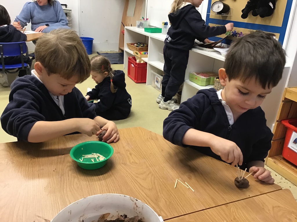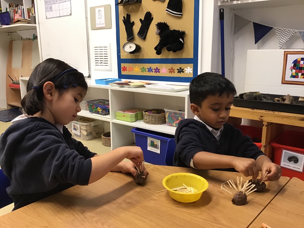 This week we moulded clay into round-ish shapes and added lots of match sticks creating very spiky hedgehogs. Once dried, the children made a nest each for their hedgehogs to hibernate in at home.